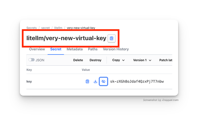 LiteLLM stores secret under the prefix_for_stored_virtual_keys path (default: litellm/)